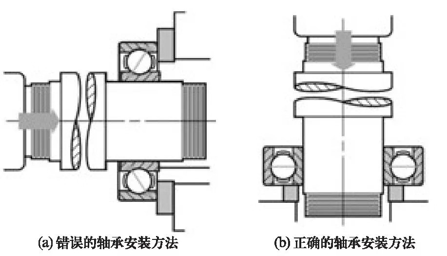 安裝壓力應(yīng)直接施加于過盈配合的軸承套圈端面上,否則會在軸承工作表面上造成壓傷,導(dǎo)致軸承很快地?fù)p壞。