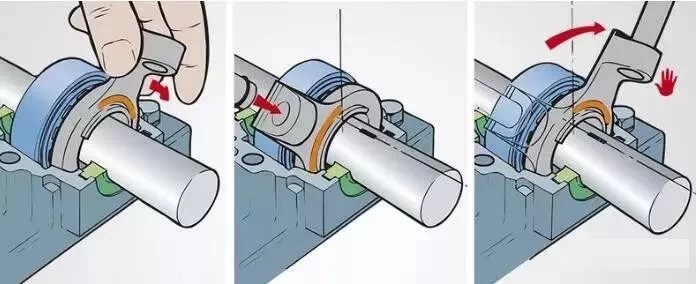 安裝時(shí)對軸承施加的作用力,絕不可通過滾動(dòng)體從一個(gè)軸承圈傳遞到另一個(gè)軸承圈,否則可能會對滾道造成損壞。但在任何情況下,都不可以直接敲擊軸承圈、保持架、滾動(dòng)體或密封件。